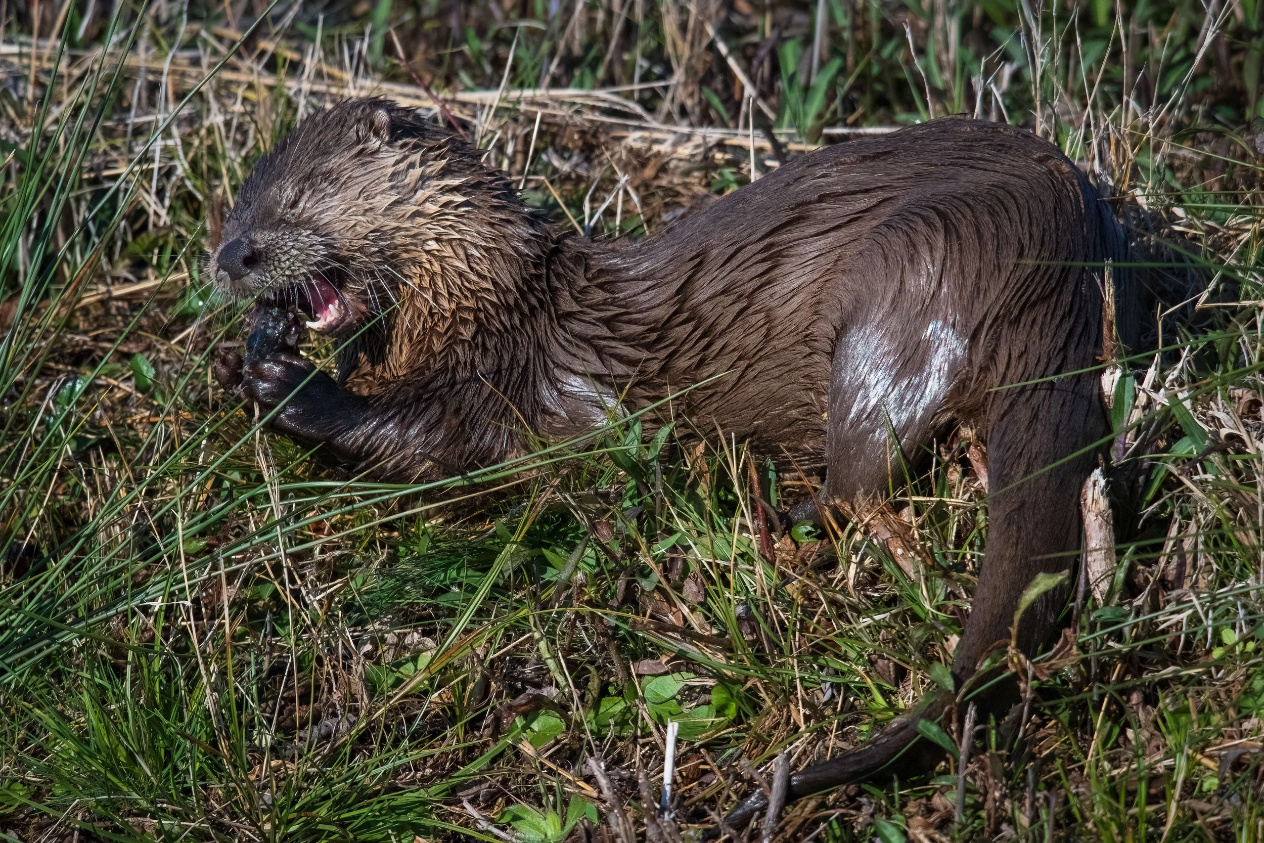 In this photo, a mink is captured taking a moment to lick its chops after feasting on crawfish along the Atlantic Ocean. The mink is located on a rocky outcropping overlooking the ocean, referred to as the Jetty, surrounded by seaweed and barnacles. Its sleek, dark fur is wet and shiny from the salty sea water. The mink's expression is content, with its eyes closed and tongue extended as it savors the taste of its recent meal. The photo offers a glimpse into the life of this fascinating and elusive creature, and showcases the beauty of the nature and its inhabitants.